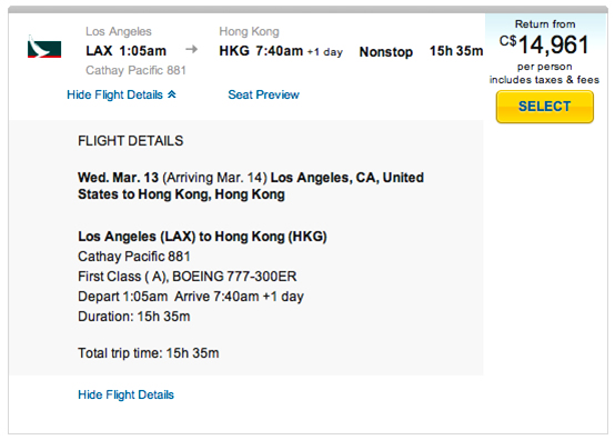 But instead of paying $14,961, you pay only $408.23 for taxes and fees for your Cathay Pacific flight.